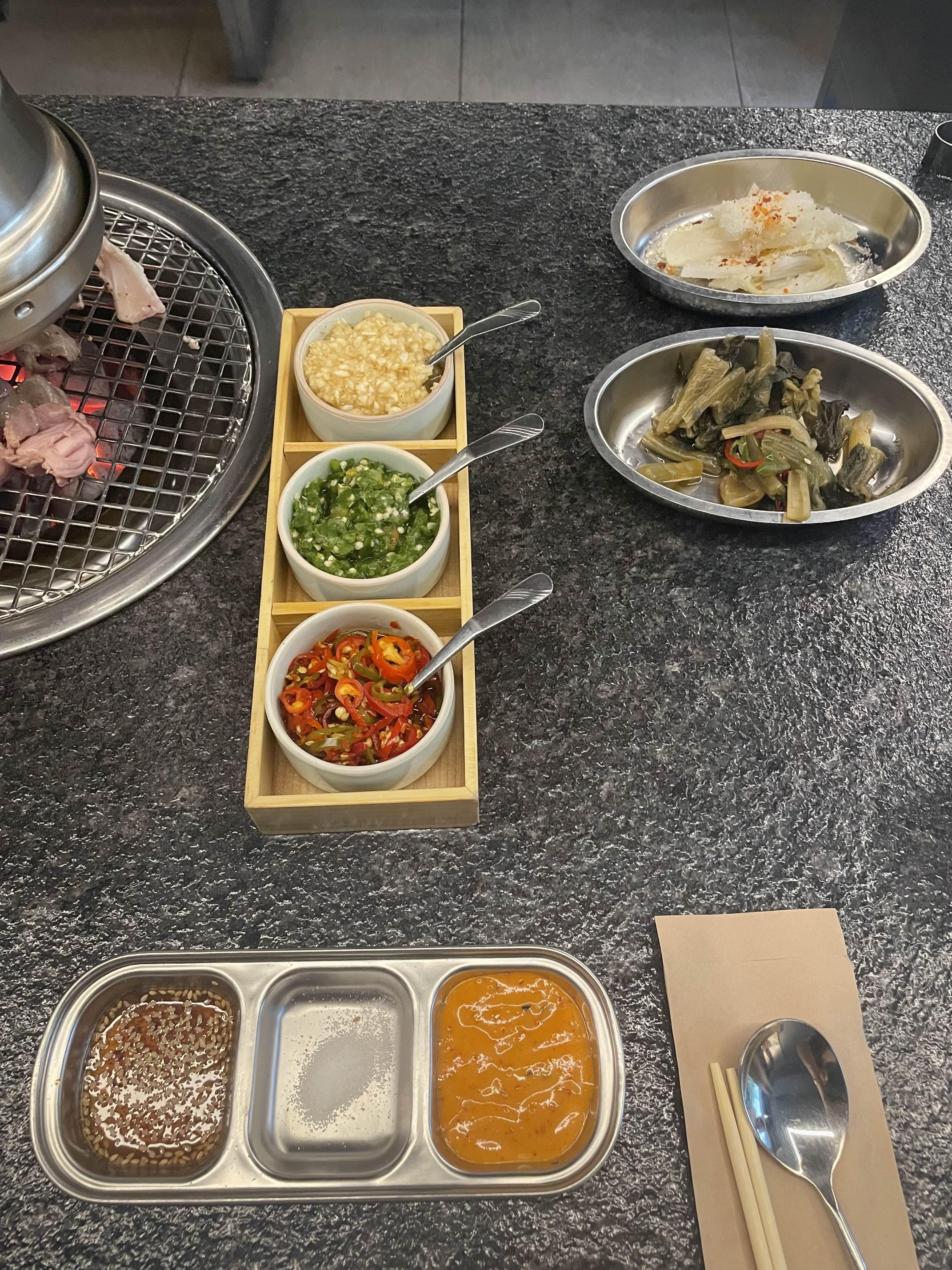 소스는 위에서부터 마늘소스, 유자코쇼, 양념고추