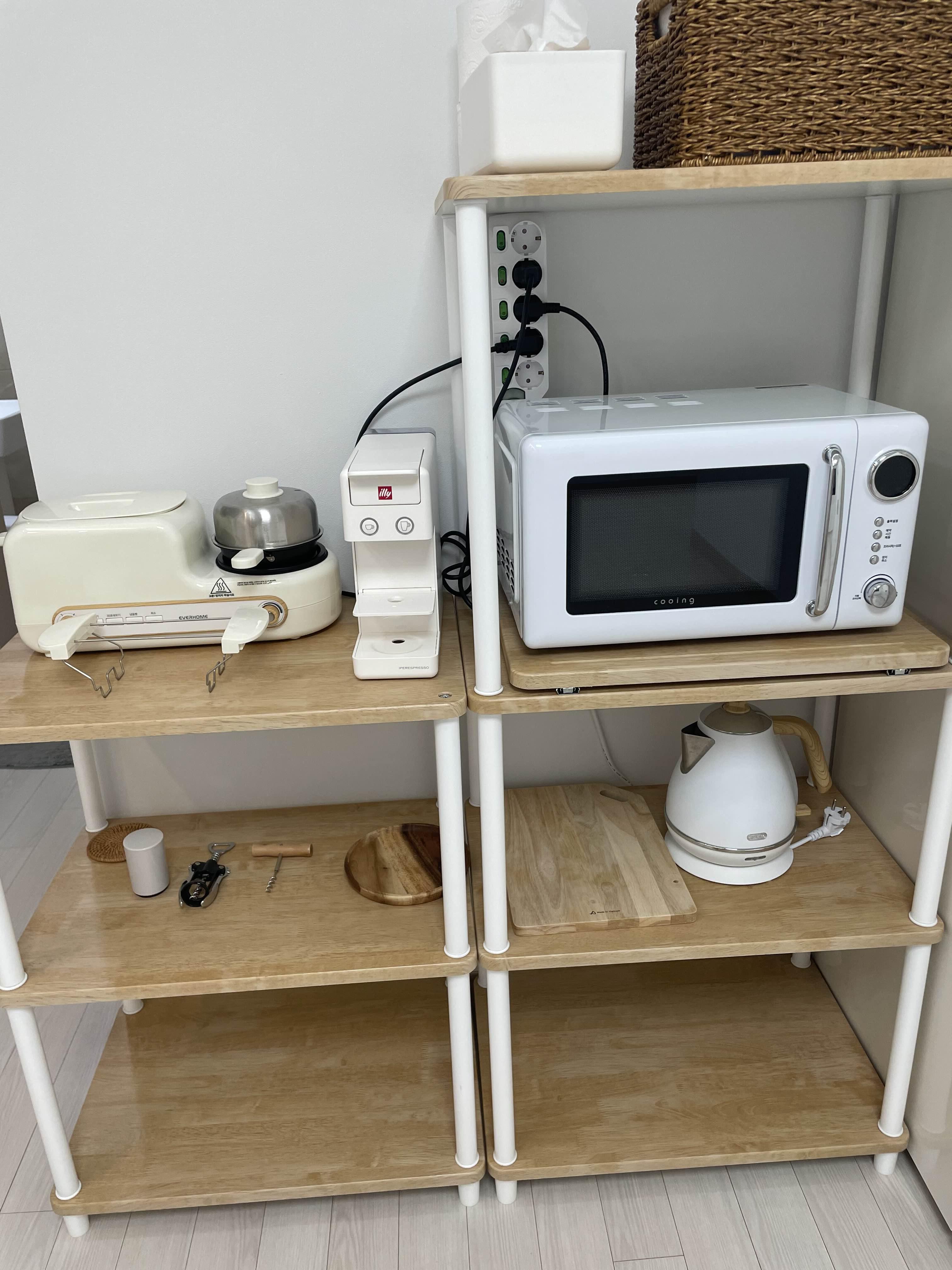 선반에도 커피머신, 전자레인지, 커피포트, 도마 등 필요한 건 거의 다 있다 할 수 있었어요
